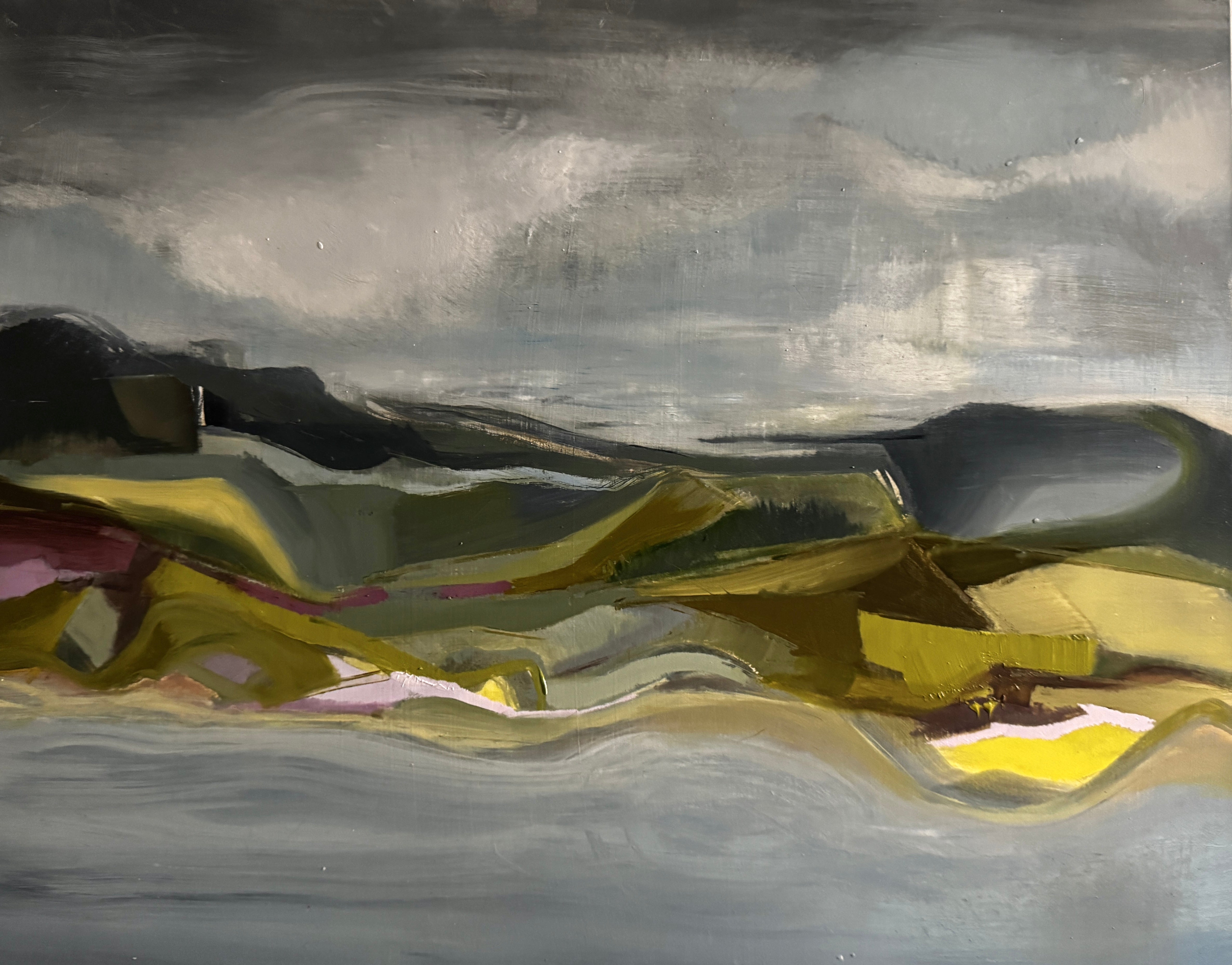 Anna Brice Cockland is a painter whose work moves between abstraction and figuration, exploring memory, landscape, and perception through intuitive mark-making. Using oil, pigment, and collage, she creates layered compositions that balance energy and stillness. Her work is held in notable public and private collections, and she now paints from her studio in Naast, Scotland, where the surrounding land continues to shape her evolving practice.