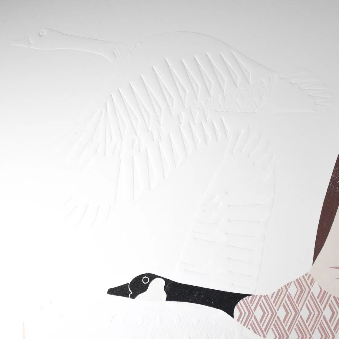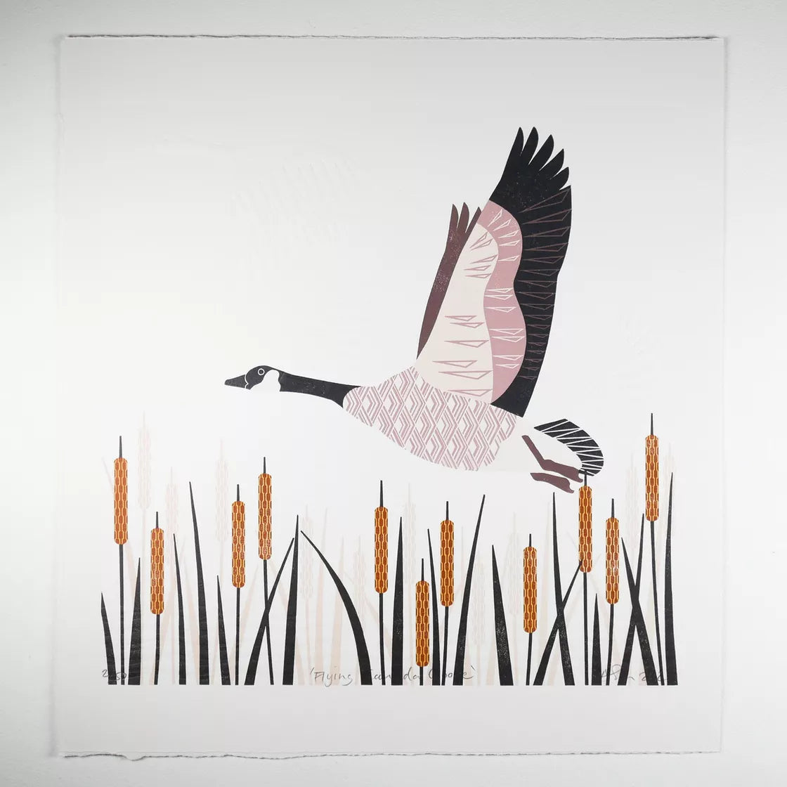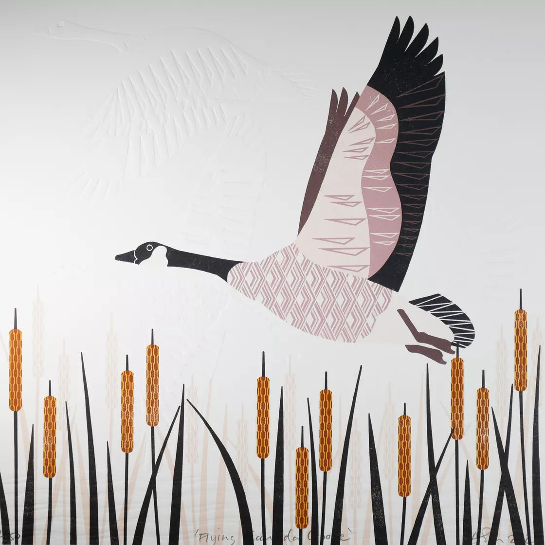 A beautiful Canada goose soars above tall bulrushes, with three more geese subtly hand-embossed into the scene. This limited-edition lino cut by Ashley Hutchinson is created using seven colour layers, combining rich detail and depth with the artist’s distinctive embossed finish.