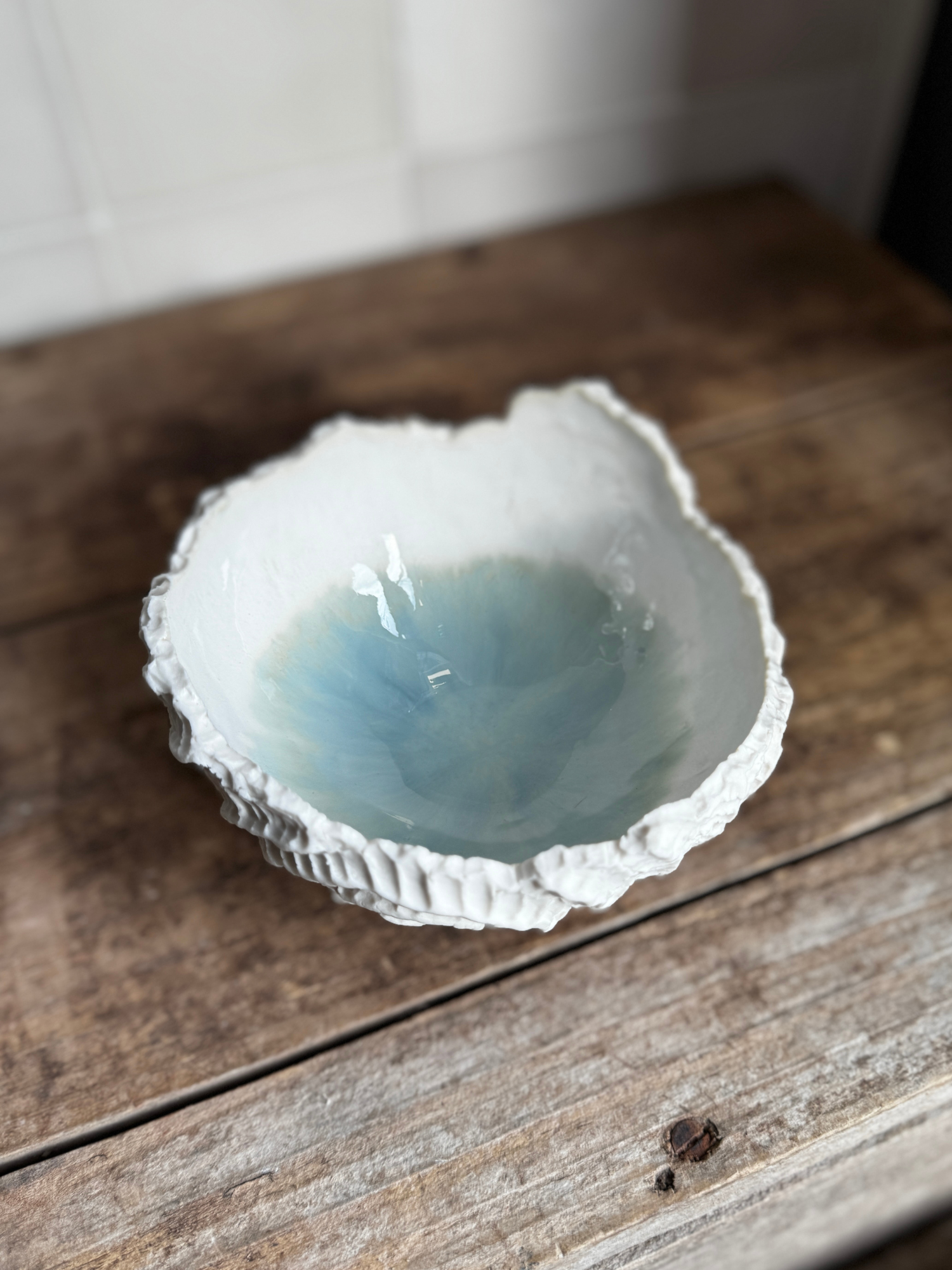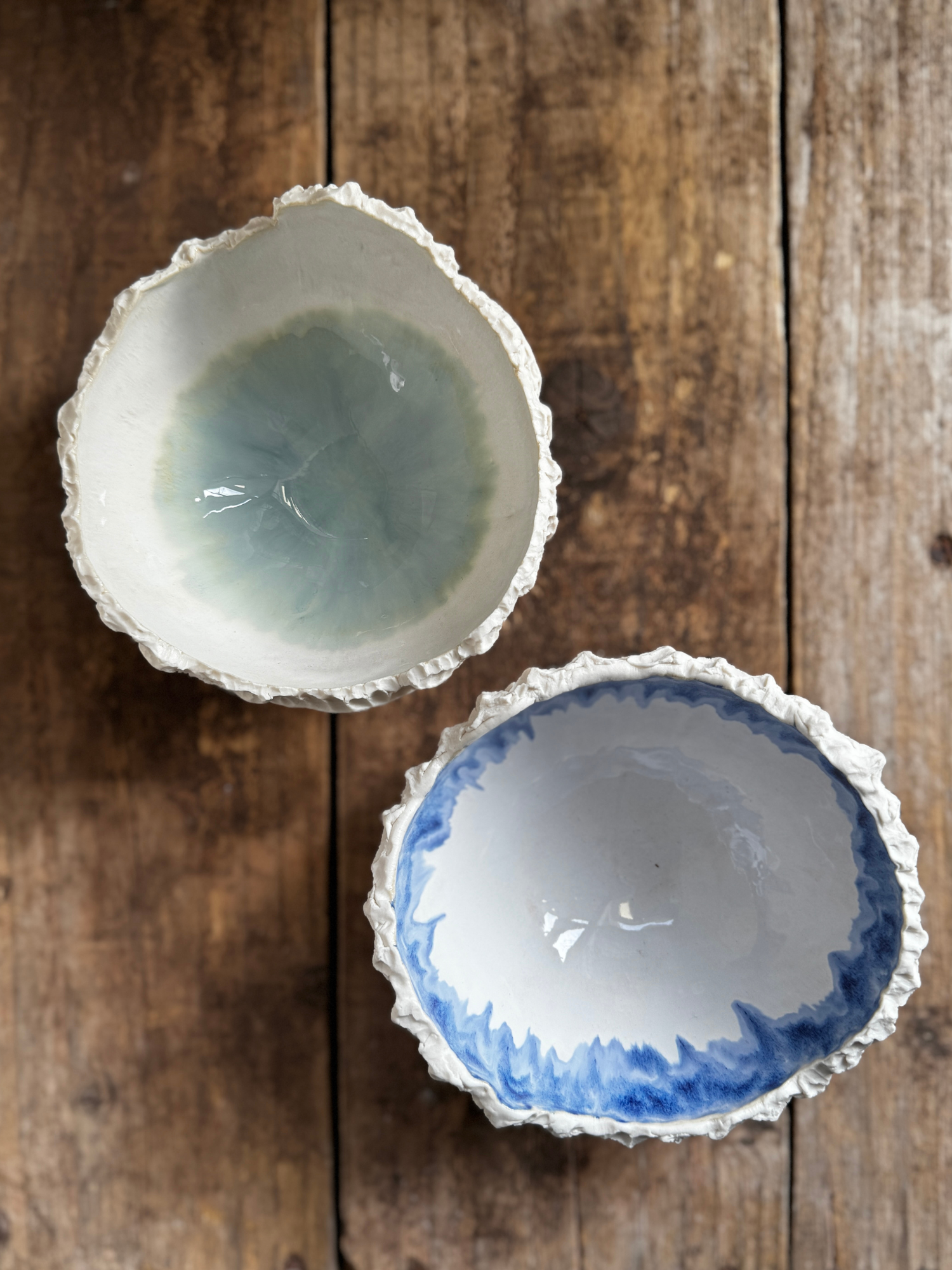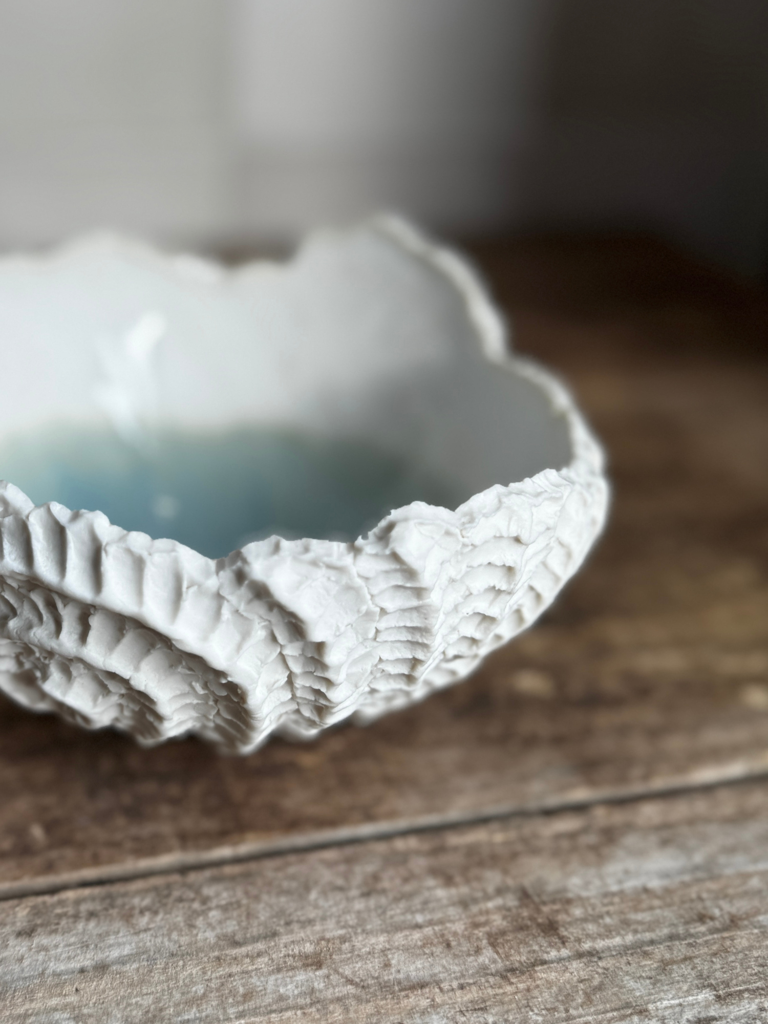 A handbuilt porcelain bowl inspired by the sea. The unglazed exterior contrasts with a glazed interior that reflects the colours... Read more