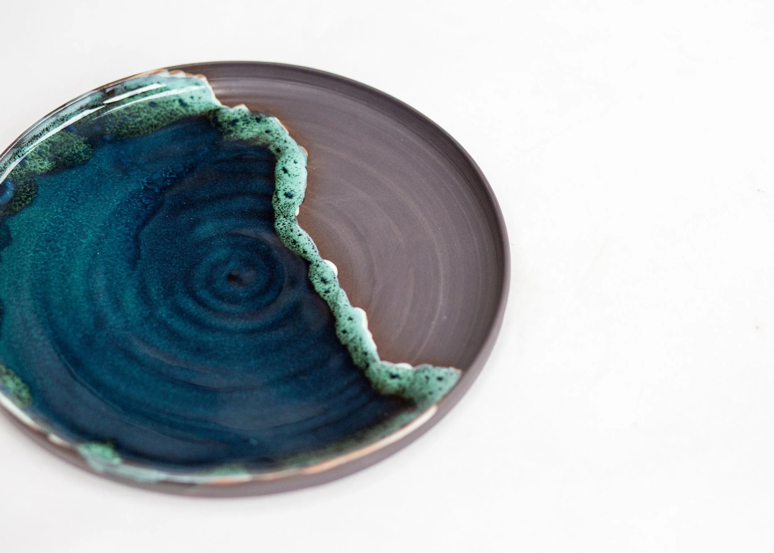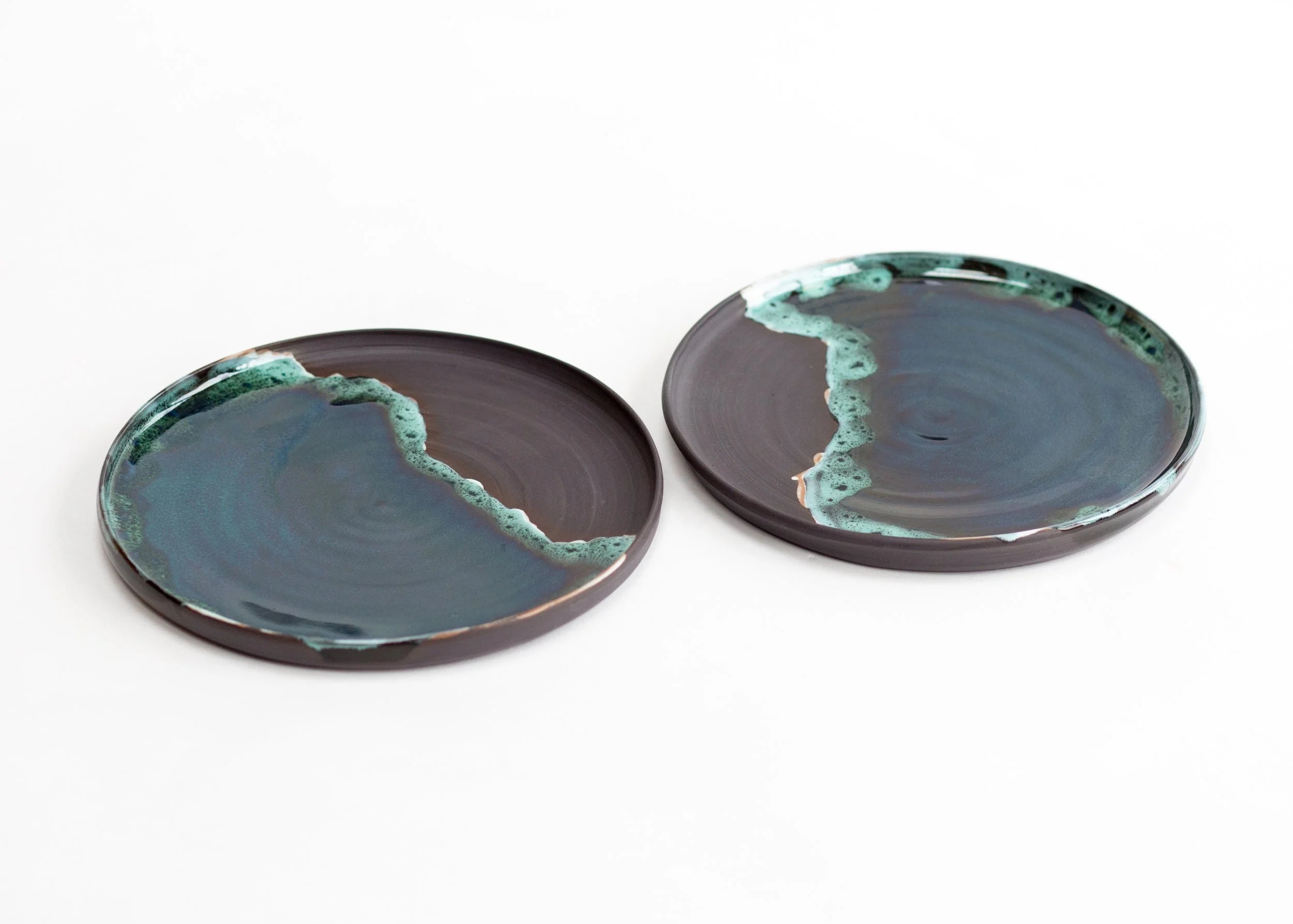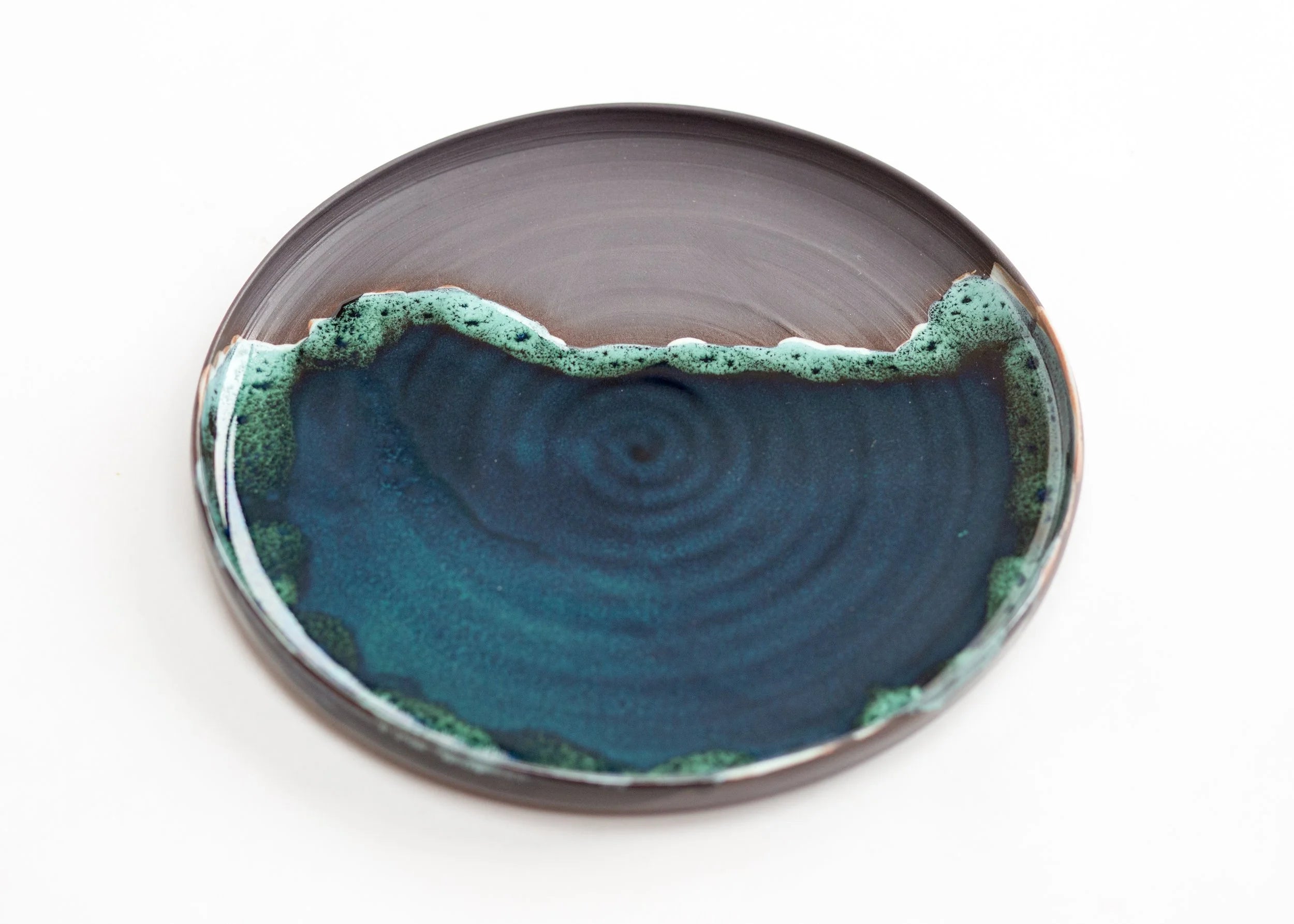 Thrown in onyx black porcelain and part glazed in copper green and tin layers dipped and poured. This small plate... Read more