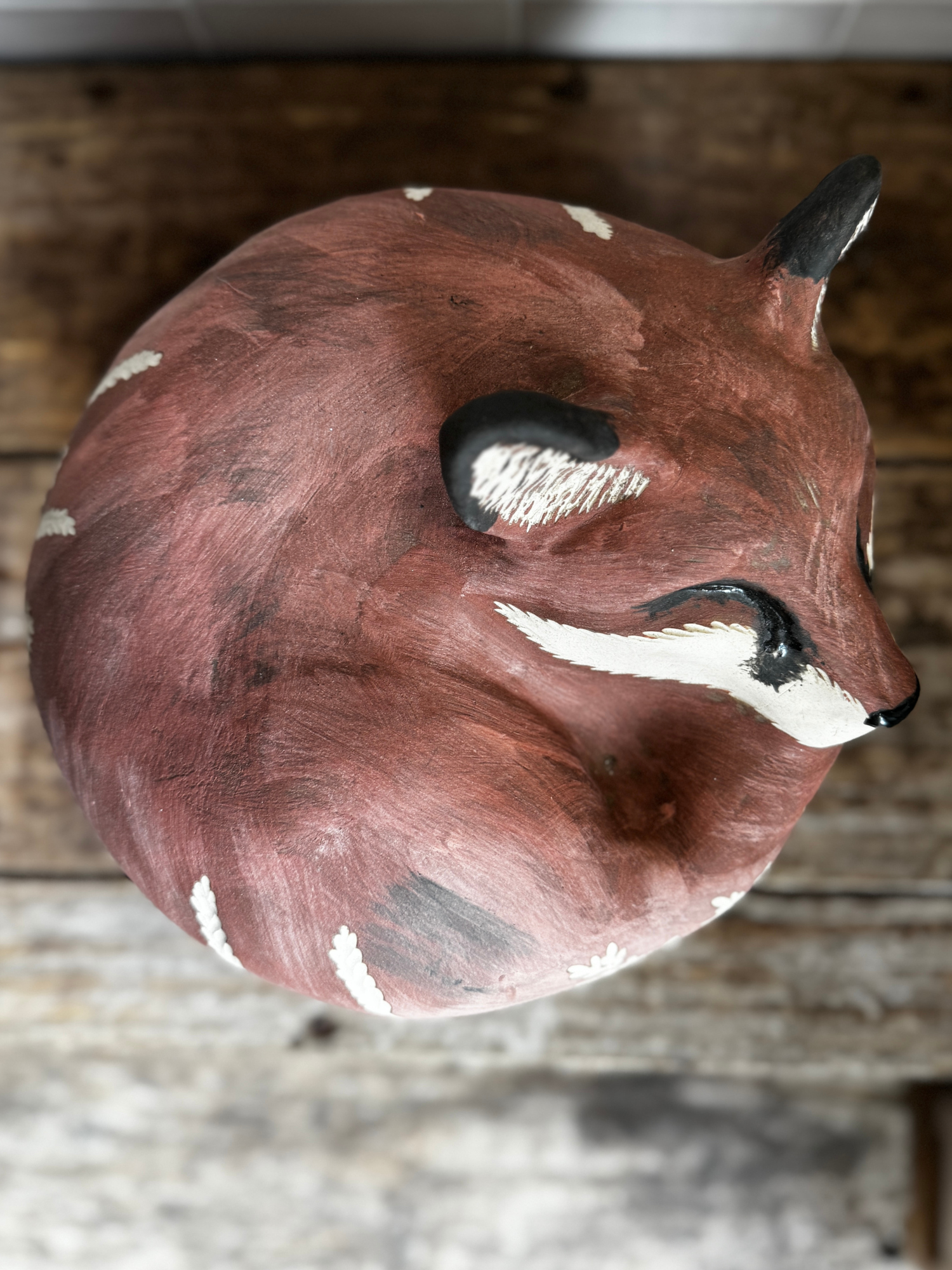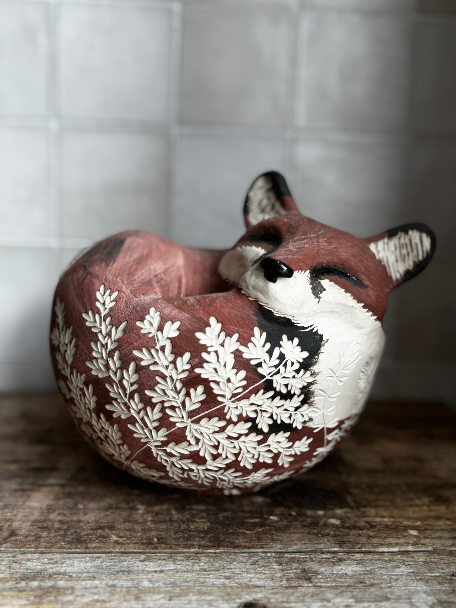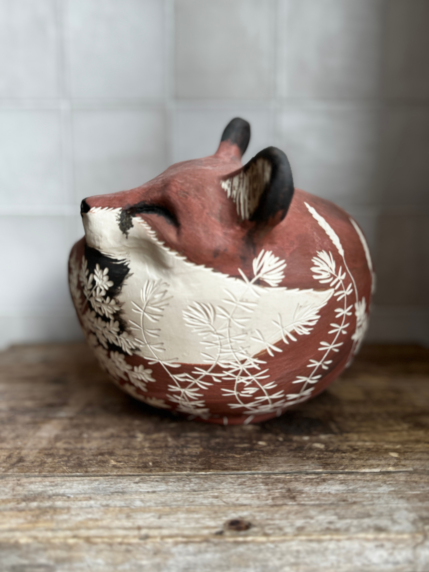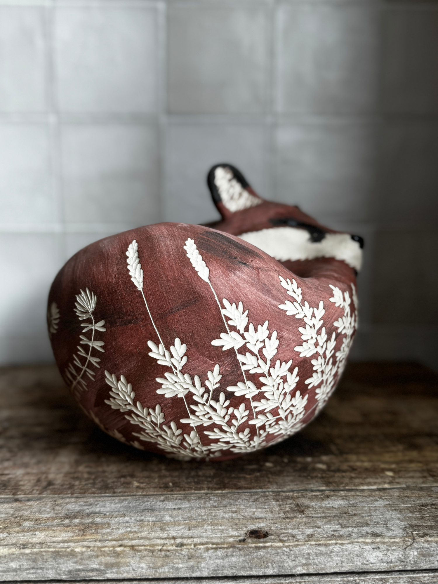 A handcrafted stoneware vessel depicting a British fox asleep among wildflowers. Each piece begins as a wheel-thrown bowl, joined with... Read more