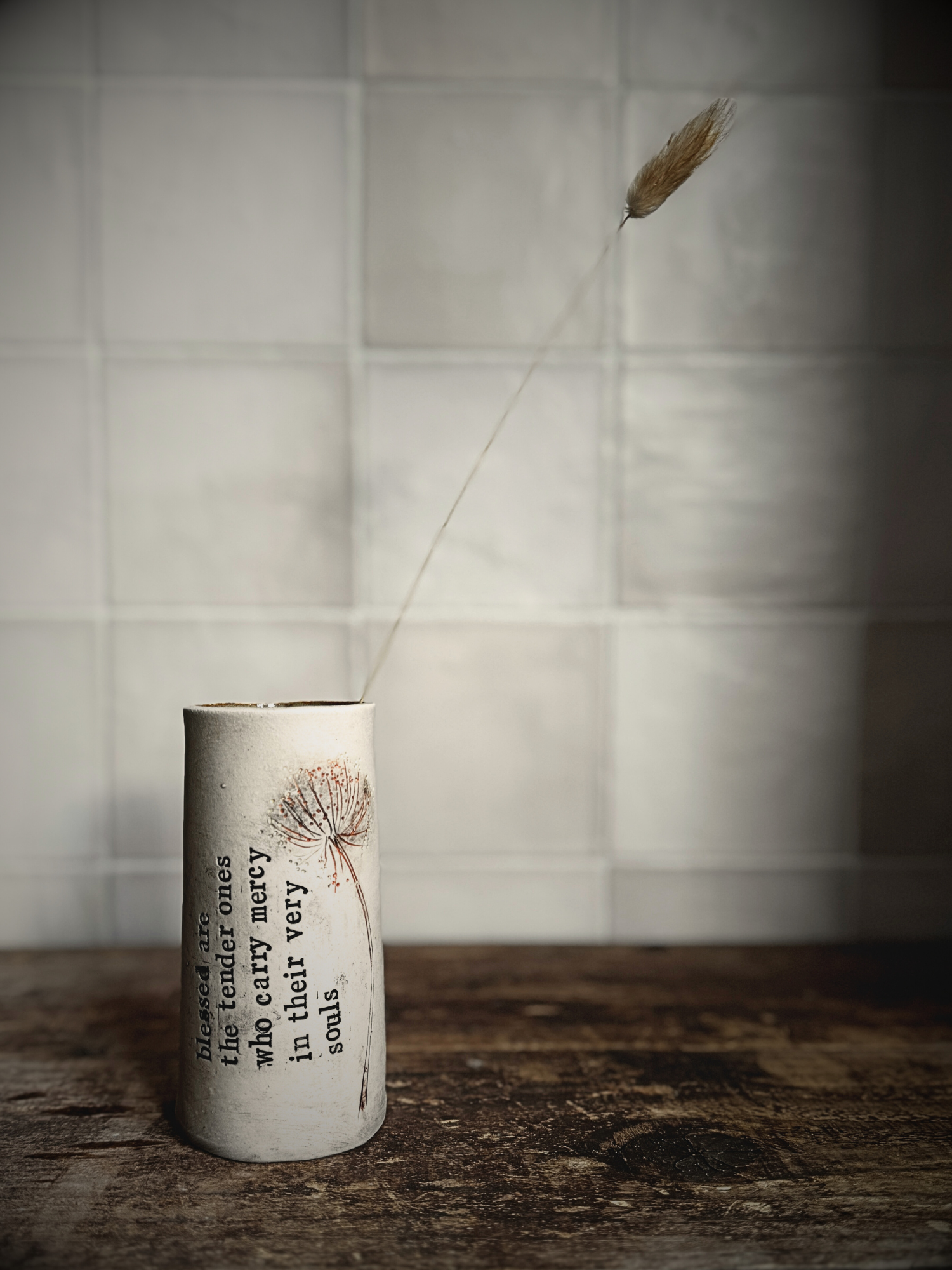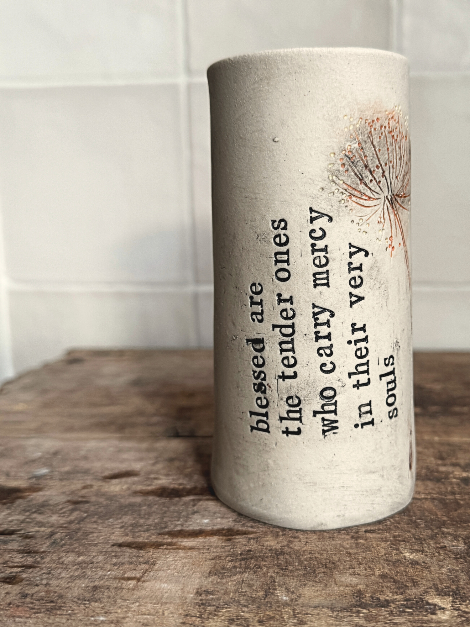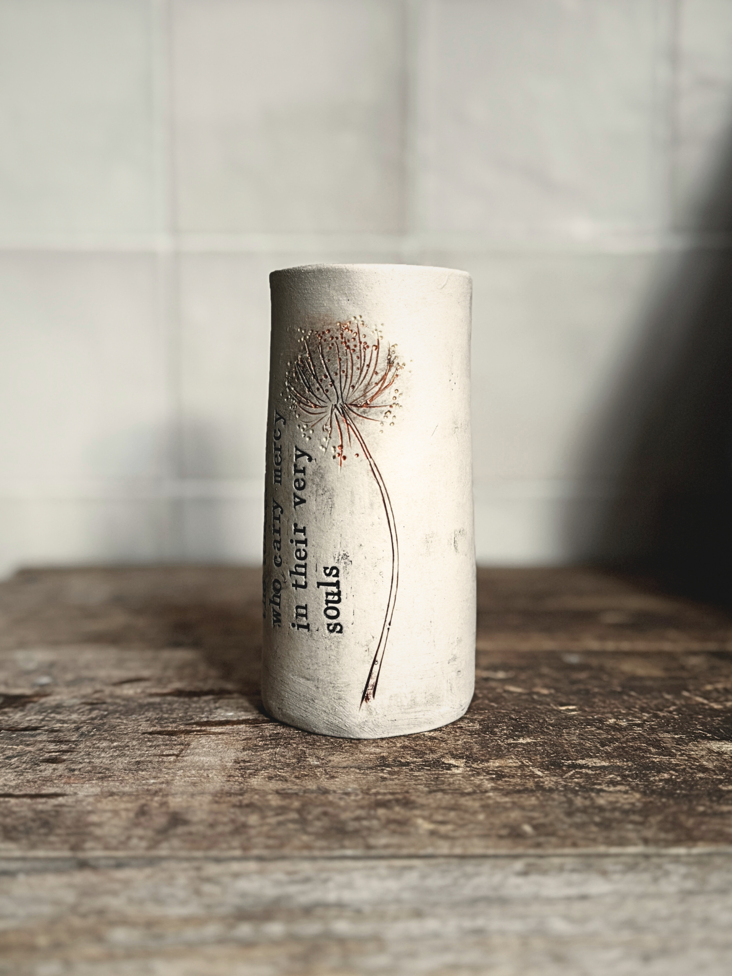 This hand-built stoneware vase carries lines of poetry stamped letter by letter into the clay before its first firing. After... Read more